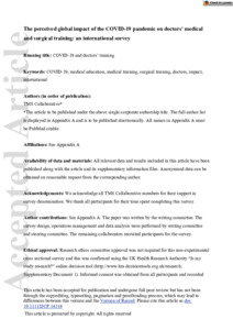 Laloo, Ryan, Karri, Rama Santhosh, Wanigasooriya, Kasun, Beedham, William, Darr, Adnan, Layton, Georgia R., Logan, Peter, Tan, Yanyu, Mittapalli, Devender et al (2021) The perceived global impact of the COVID‐19 pandemic on doctors’ medical and surgical training: an international survey. International Journal of Clinical Practice, 75 (8). e14314. ISSN 1368-5031