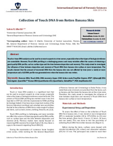 Touch or trace DNA analysis can be used to connect suspects to crime scenes, especially when other types of biological evidence are unavailable. However, Touch DNA profiling is a challenging process and many variables affect the success of obtaining a good quality DNA profile, such as surface type and the time between deposition and recovery. This study aimed to investigate the influence of time between deposition and recovery of Touch DNA from banana skin surface at room temperature. The results showed that the amount of recovered DNA from the banana skin was not affected by time (over a week) at room temperature and a full DNA profile was generated even when the banana skin was rotten.
