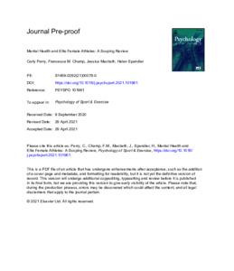 Perry, Carly, Champ, Francesca M., Macbeth, Jessica Louise orcid iconORCID: 0000-0002-2564-2267 and Spandler, Helen orcid iconORCID: 0000-0002-0970-5141 (2021) Mental Health and Elite Female Athletes: A Scoping Review. Psychology of Sport and Exercise . ISSN 1469-0292