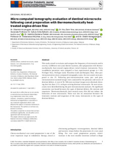 Arumugam, Sharmini, Yew, Hsu Zenn, Baharin, Safura Anita, Zaman, Jasmina, Muchtar, Andanastuti and Kanagasingam, Shalini (2021) Micro‐computed tomography evaluation of dentinal microcracks following canal preparation with thermomechanically heat‐treated engine‐driven files. Australian Endodontic Journal, 47 (3). pp. 520-530. ISSN 1329-1947