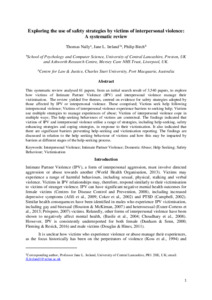 This systematic review analysed 61 papers, from an initial search result of 3,540 papers, to explore how victims of Intimate Partner Violence (IPV) and interpersonal violence manage their victimisation. The review yielded five themes, centred on evidence for safety strategies adopted by those affected by IPV or interpersonal violence. These comprised; Victims seek help following interpersonal violence; Victims of interpersonal violence experience barriers to seeking help; Victims use multiple strategies to manage experiences of abuse; Victims of interpersonal violence cope in multiple ways; The help-seeking behaviours of victims are contextual. The findings indicated that victims of IPV and interpersonal violence utilise a range of strategies, including help-seeking, safety enhancing strategies and coping strategies, in response to their victimisation. It also indicated that there are significant barriers preventing help-seeking and victimisation reporting. The findings are discussed in relation to the help seeking behaviour of victims and how this may be impacted by barriers at different stages of the help-seeking process.