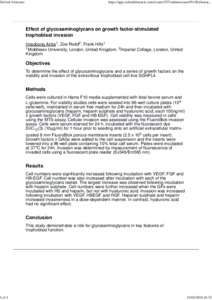 Methods: Cells were cultured in Hams F10 media supplemented with fetal bovine serum and L-glutamine. For viability studies cells were seeded into 96-well culture plates (10,000 cells/well), maintained in serum free medium for 24h and then incubated with glycosaminoglycans (heparin, heparin sulphate and hyaluronic acid; each 100ng/ml) ± growth factors (VEGF, FGF and HB-EGF). Cell viability was measured in cells using the MTS assay. Cellular invasion was assessed using the FluoroBlok invasion assay. Cells were serum-starved for 24 h, incubated with the fluorescent dye DiIC12(3) (10μg/ml) for 1 hour prior to seeding onto an artificial extracellular matrixcoated 8 mm FluoroBlok porous membrane inserts (250,000 cells per insert). Growth factors ± GAGs were added to the cell suspension and the inserts were lowered into a 96-well plate containing 10% fetal calf serum. Plates were incubated at 37°C for 24h. Invasion was determined by measurement of fluorescence of invaded cells using a fluorescent plate reader (Ex549/Em565 nm).
