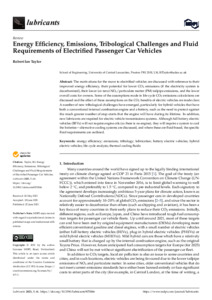 The motivations for the move to electrified vehicles are discussed with reference to their improved energy efficiency, their potential for lower CO2 emissions (if the electricity system is decarbonized), their lower (or zero) NOx/particulate matter (PM) tailpipe emissions, and the lower overall costs for owners. Some of the assumptions made in life-cycle CO2 emissions calculations are discussed and the effect of these assumptions on the CO2 benefits of electric vehicles are made clear. A number of new tribological challenges have emerged, particularly for hybrid vehicles that have both a conventional internal combustion engine and a battery, such as the need to protect against the much greater number of stop-starts that the engine will have during its lifetime. In addition, new lubricants are required for electric vehicle transmissions systems. Although full battery electric vehicles (BEVs) will not require engine oils (as there is no engine), they will require a system to cool the batteries—alternative cooling systems are discussed, and where these are fluid-based, the specific fluid requirements are outlined.