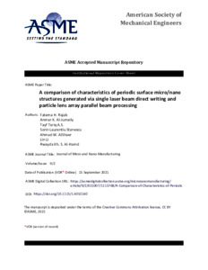 A Comparison of Characteristics of Periodic Surface Micro/Nano Structures Generated Via Single Laser Beam Direct Writing and Particle Lens Array Parallel Beam Processing.