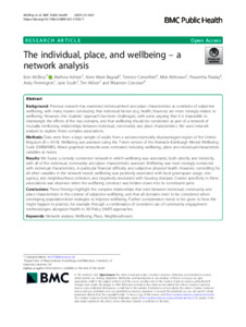 Abstract: Background: Previous research has examined individual-level and place characteristics as correlates of subjective wellbeing, with many studies concluding that individual factors (e.g. health, finances) are more strongly related to wellbeing. However, this ‘dualistic’ approach has been challenged, with some arguing that it is impossible to disentangle the effects of the two domains, and that wellbeing should be considered as part of a network of mutually reinforcing relationships between individual, community and place characteristics. We used network analysis to explore these complex associations. Methods: Data were from a large sample of adults from a socioeconomically disadvantaged region of the United Kingdom (N = 4319). Wellbeing was assessed using the 7-item version of the Warwick–Edinburgh Mental Wellbeing Scale (SWEMWBS). Mixed graphical networks were estimated including wellbeing, place and individual-characteristic variables as nodes. Results: We found a densely connected network in which wellbeing was associated, both directly and indirectly, with all of the individual, community and place characteristics assessed. Wellbeing was most strongly connected with individual characteristics, in particular financial difficulty and subjective physical health. However, controlling for all other variables in the network model, wellbeing was positively associated with local greenspace usage, civic agency, and neighbourhood cohesion, and negatively associated with housing disrepair. Greater specificity in these associations was observed when the wellbeing construct was broken down into its constituent parts. Conclusions: These findings highlight the complex relationships that exist between individual, community and place characteristics in the context of subjective wellbeing, and that all domains need to be considered when developing population-level strategies to improve wellbeing. Further consideration needs to be given to how this might happen in practice, for example through a combination of consistent use of community engagement methodologies alongside Health in All Policy (HiAP) approaches.