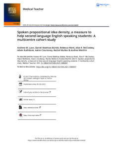 Lunn, Andrew orcid iconORCID: 0000-0003-2884-2755, Bürkle, Daniel Matthias orcid iconORCID: 0000-0001-5531-2122, Ward, Rebecca Jayne, McCloskey, Alice P., Rathbone, Adam, Courtenay, Aaron, Mullen, Rachel and Manfrin, Andrea orcid iconORCID: 0000-0003-3457-9981 (2022) Spoken propositional idea density, a measure to help second language English speaking students: a multicentre cohort study. Medical Teacher, 44 (3). pp. 267-275. ISSN 0142-159X