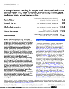 A comparison of reading, in people with simulated and actual central vision loss, with static text, horizontally-scrolling text and rapid serial visual presentation (RSVP).