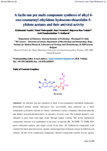 A facile one pot multi component synthesis of alkyl 4-oxo-coumarinyl ethylidene hydrazono-thiazolidin-5-ylidene acetates and their antiviral activity.