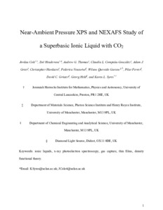 Cole, Jordan, Henderson, Zoe, Thomas, Andrew, Compean-Gonzalez, Claudia L., Greer, Adam J., Hardacrew, Christopher, Venturini, Federica, Quevedo Garzon, Wilson, Ferrer, Pilar et al (2021) Near-Ambient Pressure XPS and NEXAFS Study of a Superbasic Ionic Liquid with CO2. The Journal of Physical Chemistry C, 125 (41). pp. 22778-22785. ISSN 1932-7447