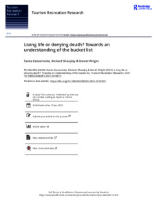 Since the movie The Bucket List was released in 2007, the practice of compiling a list of things that people wish to achieve during their lifetime – a bucket list – has become increasingly popular amongst not only those who have received a terminal diagnosis (as in the movie) but also the wider population. Moreover, predominant in such lists are tourism-related goals. Surprisingly, however, little academic attention has been paid to the role and significance of the bucket list. The purpose of this paper is to address this gap in the literature. Drawing on the outcomes of an exploratory survey framed within terror management theory, it considers the relationship between the bucket list and existential anxieties and, in particular, the extent to which a fear of death motivates the compilation of such a list. The research reveals that the compiling a bucket list has become a contemporary cultural practice which, though evidently a means of managing existential anxieties, is also an explicit manifestation of consumption directed towards the creation of identity and self esteem. The paper concludes by identifying future areas of research in the context of the bucket list.