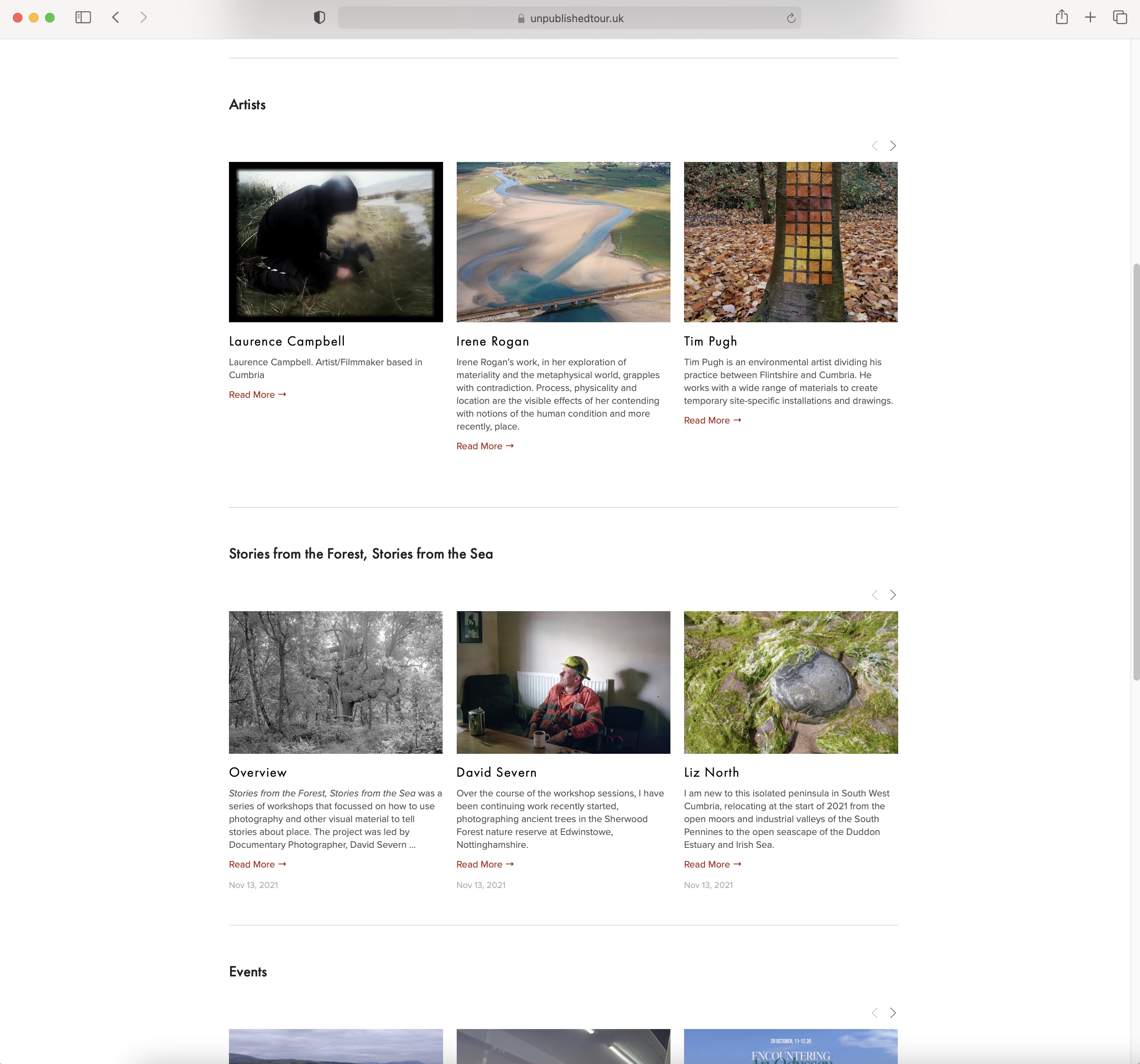 'Unpublished Tour' was a programme of events and art commissions devised by artist Irene Rogan, which ran between August and December 2021. It featured the input and work of ten artists from Cumbria and beyond, as well as other local participants who took park in a six-week long workshop with internationally acclaimed photographer, David Severn, and contributed work as part of their projects.