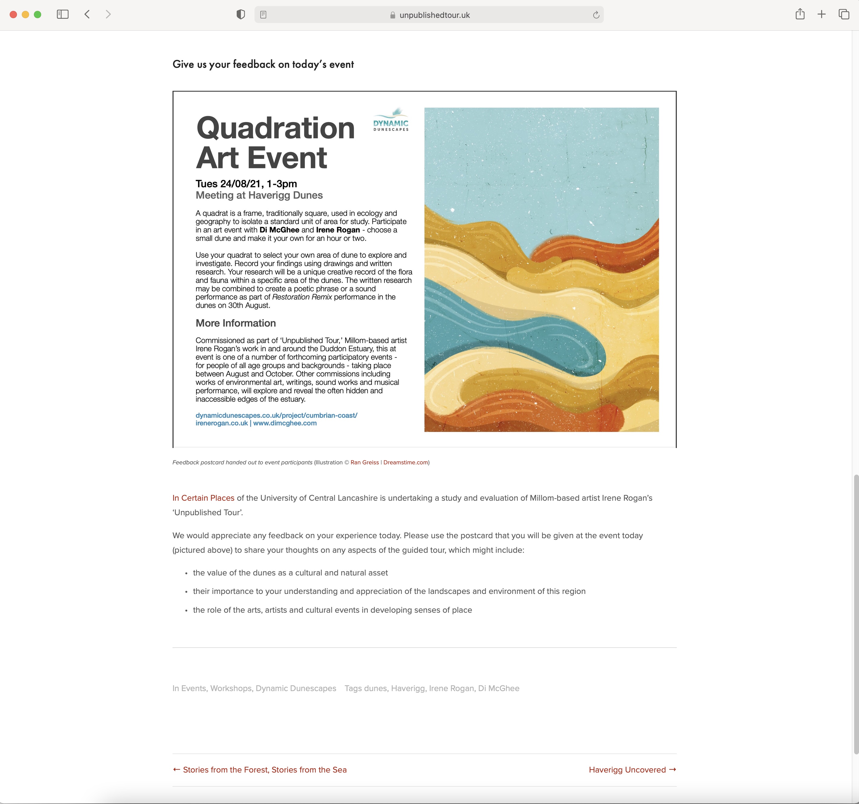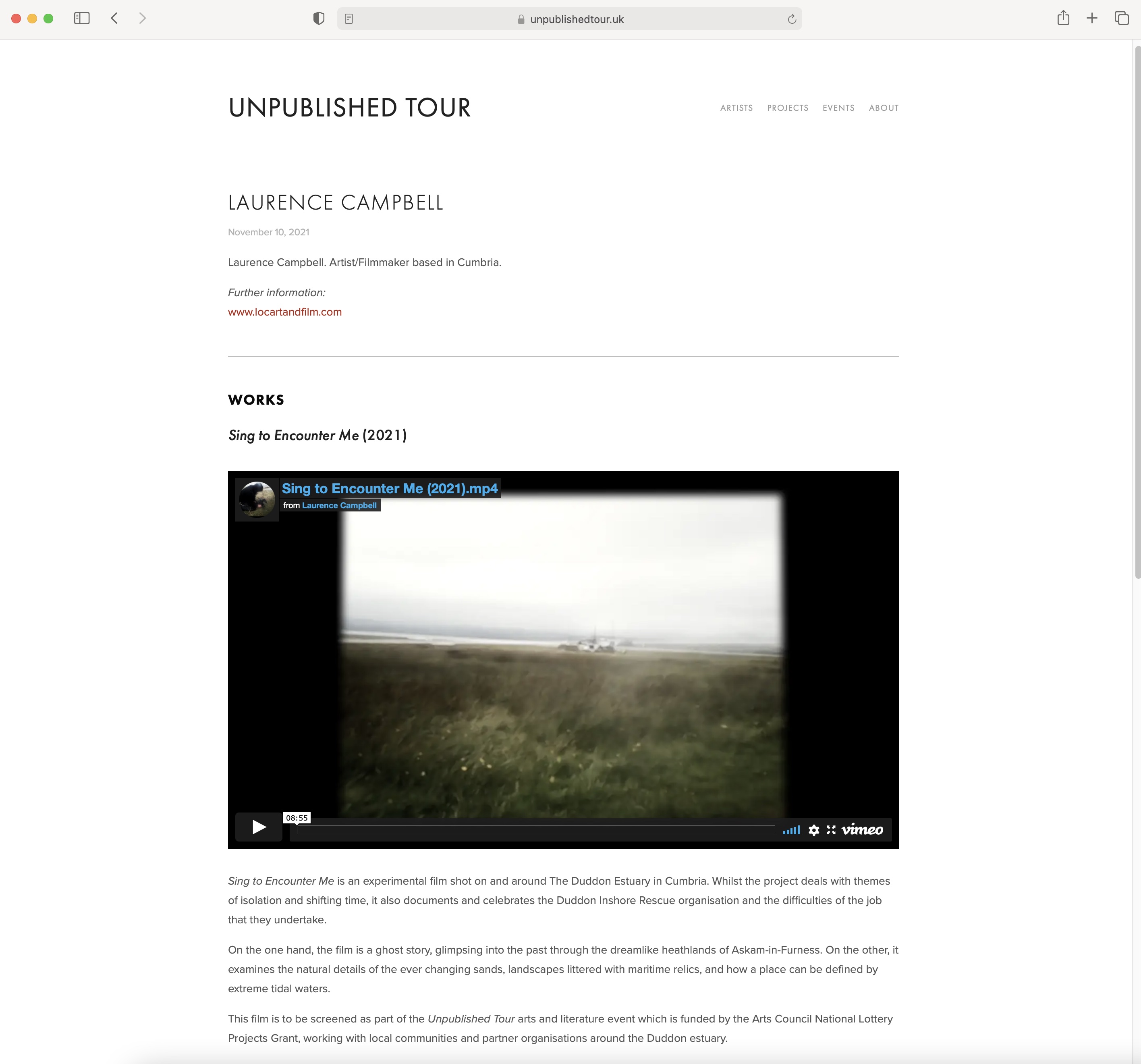 The website was designed with the additional purpose of furthering John Scanlan's own complimentary research and practice-based work in West Cumbria, which is concerned in large part with developing the cultural ecology of the region, which is to say, bringing together and acting as a presence that connects the often disparate stakeholders, artists and other organisations doing cultural work in the region. The website, therefore, is at once an archive, but also a means of giving presence to the dispersed and little known artistic community of the region, and finally a means of presenting a place - the Duddon Estuary and the landscapes and places around its edges - through a variety of visual and artistic representations as collected on the website.