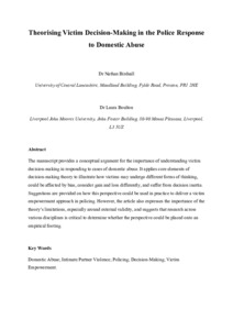 The manuscript provides a conceptual argument for the importance of understanding victim decision-making in responding to cases of domestic abuse. It applies core elements of decision-making theory to illustrate how victims may undergo different forms of thinking, could be affected by bias, consider gain and loss differently, and suffer from decision inertia. Suggestions are provided on how this perspective could be used in practice to deliver a victim empowerment approach in policing. However, the article also expresses the importance of the theory’s limitations, especially around external validity, and suggests that research across various disciplines is critical to determine whether the perspective could be placed onto an empirical footing.