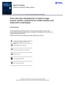 implemented 320 kilometres from Baku. This juxtaposition and frame of reference emphasises some key issues facing Azerbaijan and contextualises the subsequent modernisation and impact of hosting events. Data are examined from interviews conducted in 2004, 2019 and 2021 comprising international aid workers, civilians, translators and event spectators. This longitudinal study investigates Azerbaijan’s political context and conflicts, sport-for-development, energy wealth, modernisation projects, sports event hosting and statecraft