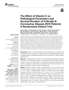 Majidi, Nazanin, Rabbani, Faezeh, Gholami, Somayeh, Gholamalizadeh, Maryam, BourBour, Fatemeh, Rastgoo, Samira, Hajipour, Azadeh, Shadnoosh, Mahdi, Akbari, Mohammad Esmail et al (2021) The Effect of Vitamin C on Pathological Parameters and Survival Duration of Critically Ill Coronavirus Disease 2019 Patients: A Randomized Clinical Trial. Frontiers in Immunology, 12 . p. 717816.