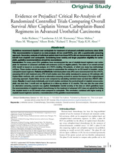 Richters, A., Kiemeney, L.A.L.M., Mehra, N., Westgeest, H., Birtle, A, Bryan, R.T. and Aben, K.K.H. (2021) Evidence or prejudice? Critical re-analysis of randomized controlled trials comparing overall survival after cisplatin versus carboplatin-based regimens in advanced urothelial carcinoma. Clinical Genitourinary Cancer . ISSN 15587673
