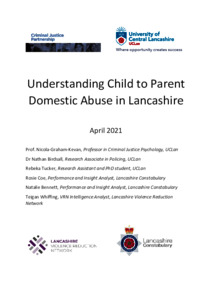Graham-Kevan, Nicola orcid iconORCID: 0000-0003-0621-3093, Birdsall, Nathan orcid iconORCID: 0000-0002-7253-9211, Tucker, Rebeka Catherine orcid iconORCID: 0000-0002-7045-4679, Coe, Rosie, Bennett, Natalie and Whiffing, Teigan (2021) Understanding Child to Parent Domestic Abuse in Lancashire (Home Office Funded). University of Central Lancashire (UCLan), Lancashire. (Unpublished)