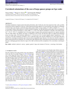 Correlated orientations of the axes of large quasar groups on Gpc scales.