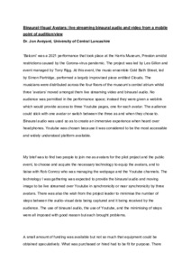 This short document begins by providing details of the performance Balconi which took place at the Harris Museum, Preston during the 2021 lockdown. Musicians were distributed across the four floors of the museum’s central atrium whilst three ‘avatars’ moved amongst them live streaming video and binaural audio. No audience was permitted in the performance space; instead they were given a weblink which would provide access to three Youtube pages, one for each avatar. The audience could stick with one avatar or switch between the three as and when they chose to.