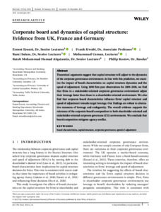Abstract: Theoretical arguments suggest that capital structure will adjust to the dynamics of the corporate governance environment. In line with this prediction, we examine the impact of board characteristics on capital structure dynamics and the speed of adjustment. Using 2690 firm‐year observations for 2009–2018, we find that firms in a stakeholder‐oriented corporate governance environment adjust their leverage faster than those in a shareholder‐oriented environment. We also find that corporate board characteristics influence firms' capital structure and speed of adjustment towards target leverage. Our findings are robust to alternative measures of leverage and endogeneity. The overall evidence supports the relevance of the corporate board's composition in both shareholder‐oriented and stakeholder‐oriented corporate governanc (CG) environments. We conclude that board composition mitigates agency conflict.