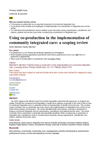 This scoping review considers how co-production has been used in the implementation of integrated care. The review identified three main themes covering co-production to improve community integrated care for organisations, practitioners and patients/service users. The review concludes that co-production is desirable and potentially beneficial. When commencing co-production in integrated care, practitioners need to consider power dynamics among organisations, practitioners and citizens, patients and service users.