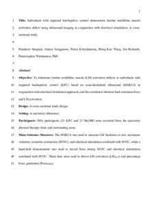 Objective: To determine lumbar multifidus muscle (LM) activation deficits in individuals with impaired lumbopelvic control (iLPC) based on musculoskeletal ultrasound (MSKUS) in conjunction with electrical stimulation approach, and the correlation between back extension force and LM activation.