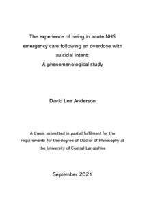 Anderson, David Lee (2021) The experience of being in acute NHS emergency care following an overdose with suicidal intent: A phenomenological study. Doctoral thesis, University of Central Lancashire.