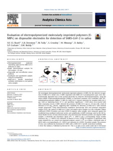 El Sharif, Hazim, Dennison, Sarah Rachel orcid iconORCID: 0000-0003-4863-9607, Tully, M., Crossley, S., Mwangi, W., Bailey, D. and Reddy, Subrayal M orcid iconORCID: 0000-0002-7362-184X (2022) Evaluation of electropolymerized molecularly imprinted polymers (E-MIPs) on disposable electrodes for detection of SARS-CoV-2 in saliva. Analytica Chimica Acta, 1206 (339777). ISSN 0003-2670