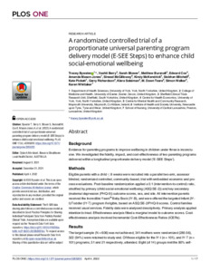 Bywater, Tracey, Berry, Vashti, Blower, Sarah, Bursnall, Matthew, Cox, Edward, Mason-Jones, Amanda, McGilloway, Sinead, McKendrick, Kirsty, Mitchell, Siobhan et al (2022) A randomized controlled trial of a proportionate universal parenting program delivery model (E-SEE Steps) to enhance child social-emotional wellbeing. PLOS ONE, 17 (4). e0265200.