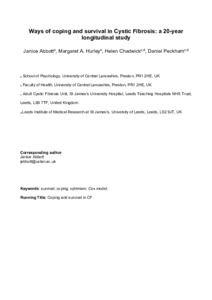 Abbott, Janice orcid iconORCID: 0000-0001-9851-1236, Hurley, Margaret Anne orcid iconORCID: 0000-0002-2502-432X, Chadwick, Helen and Peckham, Daniel (2023) Ways of coping and survival in Cystic Fibrosis: a 20-year longitudinal study. Journal of Cystic Fibrosis, 22 (1). pp. 112-118. ISSN 1569-1993