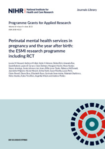 Howard, Louise M, Abel, Kathryn M, Atmore, Katie H, Bick, Debra, Bye, Amanda, Byford, Sarah, Carson, Lauren E, Dolman, Clare, Heslin, Margaret et al (2022) Perinatal mental health services in pregnancy and the year after birth: the ESMI research programme including RCT. Programme Grants for Applied Research, 10 (5). pp. 1-142. ISSN 2050-4330