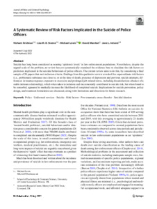 Suicide has long been considered as nearing ‘epidemic levels’ in law enforcement populations. Nevertheless, despite the argued scale of the problem, no review has yet systematically examined the evidence base to elucidate the risk factors or predictors implicated in the suicidal behaviours of police officers. The current review aims to do this, by considering a final sample of 20 papers that met inclusion criteria. Findings from this qualitative review revealed five superordinate risk factors (i.e., Problematic substance use close to, or at the time of death; Presence of depression and previous suicide attempts; Differences in trauma response; Exposure to excessive and prolonged job-related stress, including dissatisfaction; Absence of a stable intimate relationship), which when taken in isolation each incrementally contributed to suicide risk, but when found to be comorbid, appeared to markedly increase the likelihood of completed suicide. Implications for suicide prevention, policy design, and treatment formulation are discussed, along with limitations and directions for future research.