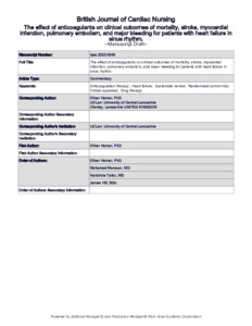 Hamer, Oliver orcid iconORCID: 0000-0002-9631-0032, Mansoor, Mohamed, Tailor, Karishma and Hill, James Edward orcid iconORCID: 0000-0003-1430-6927 (2022) The effect of anticoagulants on clinical outcomes of mortality, stroke, myocardial infarction, pulmonary embolism, and major bleeding for patients with heart failure in sinus rhythm. British Journal of Cardiac Nursing, 17 (6). ISSN 1749-6403