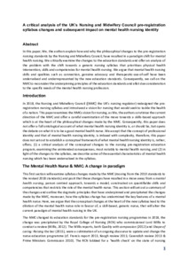 Mental health nursing identity: A critical analysis of the UK’s Nursing and Midwifery Council’s pre-registration syllabus change and subsequent move towards genericism.