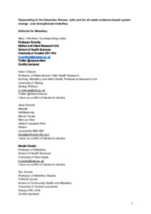 Renfrew, Mary J, Cheyne, Helen, Burnett, Alicia, Crozier, Kenda, Downe, Soo orcid iconORCID: 0000-0003-2848-2550, Heazell, Alexander, Hundley, Vanora, Hunter, Billie, King, Kay et al (2022) Responding to the Ockenden Review: Safe care for all needs evidence-based system change - and strengthened midwifery. Midwifery, 112 . p. 103391. ISSN 0266-6138