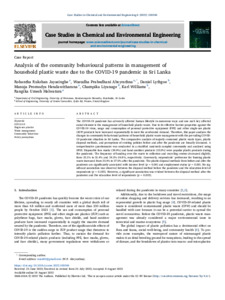 Analysis of the community behavioural patterns in management of household plastic waste due to the COVID-19 pandemic in Sri Lanka.