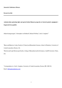 Background:Tau is an established substrate for gingipains secreted by Porphyromonas gingivalis. Hyperphosphorylation of tau and neurofibrillary tangle (NFT) formation is a defining lesion of Alzheimer’s disease (AD) where NFT distribution is related to Braak stage and disease severity. Objective:To assess gingipains’-fragmented tau peptides for their antimicrobial properties and for the likelihood of paired helical/straight filament (PHF/SF) formation with implications for the NFT lesion. Methods:Seven non-phosphorylated (A-G) and three phosphorylated (A-C) tau peptides, were tested for antimicrobial properties against P. gingivalis. Polarizing light properties were determined using Congo Red staining. Secondary and tertiary structures of peptides B-F were determined using transmission electron microscopy (TEM) and circular dichroism (CD) was undertaken for the soluble peptides A in phosphorylated and non-phosphorylated states. Results:Phosphorylated tau peptide A displayed a significant effect against planktonic P. gingivalis. The CD results demonstrated that both peptides A, in phosphorylated and non-phosphorylated states, in aqueous solution, adopted mainly β-type structures. Non-phosphorylated peptides B-F and phosphorylated peptides B-C were insoluble and fibrillar under the TEM. The secondary and tertiary structures of the non-phosphorylated peptide B demonstrated fewer helical twists, whereas peptide C displayed significantly more helical twists along the whole fiber(s) length following its phosphorylation. Conclusion:Phosphorylated peptide A reduced P. gingivalis viability. CD spectroscopy demonstrated the phosphorylated and the non-phosphorylated peptide A predominantly formed from β-sheet structures in aqueous solution with potential antimicrobial activity. Phosphorylation of tau peptides physically changed their tertiary structure into PHFs with potential for self-aggregation and binding to the NFT lesion.