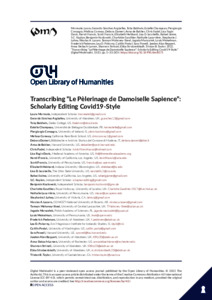Morreale, Laura, Sánchez Argüelles, Gerardo, Baldwin, Toby, Champeau, Estelle, Consagra, Piergiorgio, Conway, Melissa, Dameri, Debora, de Bakker, Anna, Fadel, Chris et al (2022) Transcribing "Le Pèlerinage de Damoiselle Sapience": Scholarly Editing Covid19-Style. Digital Medievalist (DM) Open Issue, 15 (1). ISSN 1715-0736
