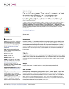 Carter, Bernie, Cook, Georgia, Bray, Lucy, Collingwood, Amber, Saron, Holly and Rouncefield-Swales, Alison (2022) Parents’/caregivers’ fears and concerns about their child’s epilepsy: A scoping review. PLOS ONE, 17 (9). e0274001. ISSN 1932-6203