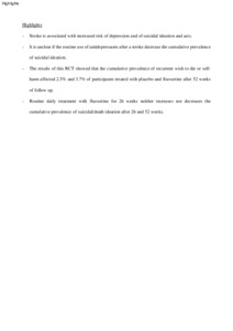 We investigated the cumulative prevalence of self-harm ideation among stroke survivors of the AFFINITY trial. We assessed these thoughts with the last item of the PHQ-9, and functional impairment with the modified Rankin Scale (mRS). Of 1221 participants (age 63.9 ± 12.3 years, 775 men), 11 reported wishing to die or self-harm at baseline. By week 52, 36 of 1159 surviving participants had reported wishing to die or self-harm. Treatment with fluoxetine for 26 weeks did not change the prevalence of these thoughts compared with placebo. Clinically significant symptoms of depression were present in 95 % of participants with recurrent self-harm thoughts.