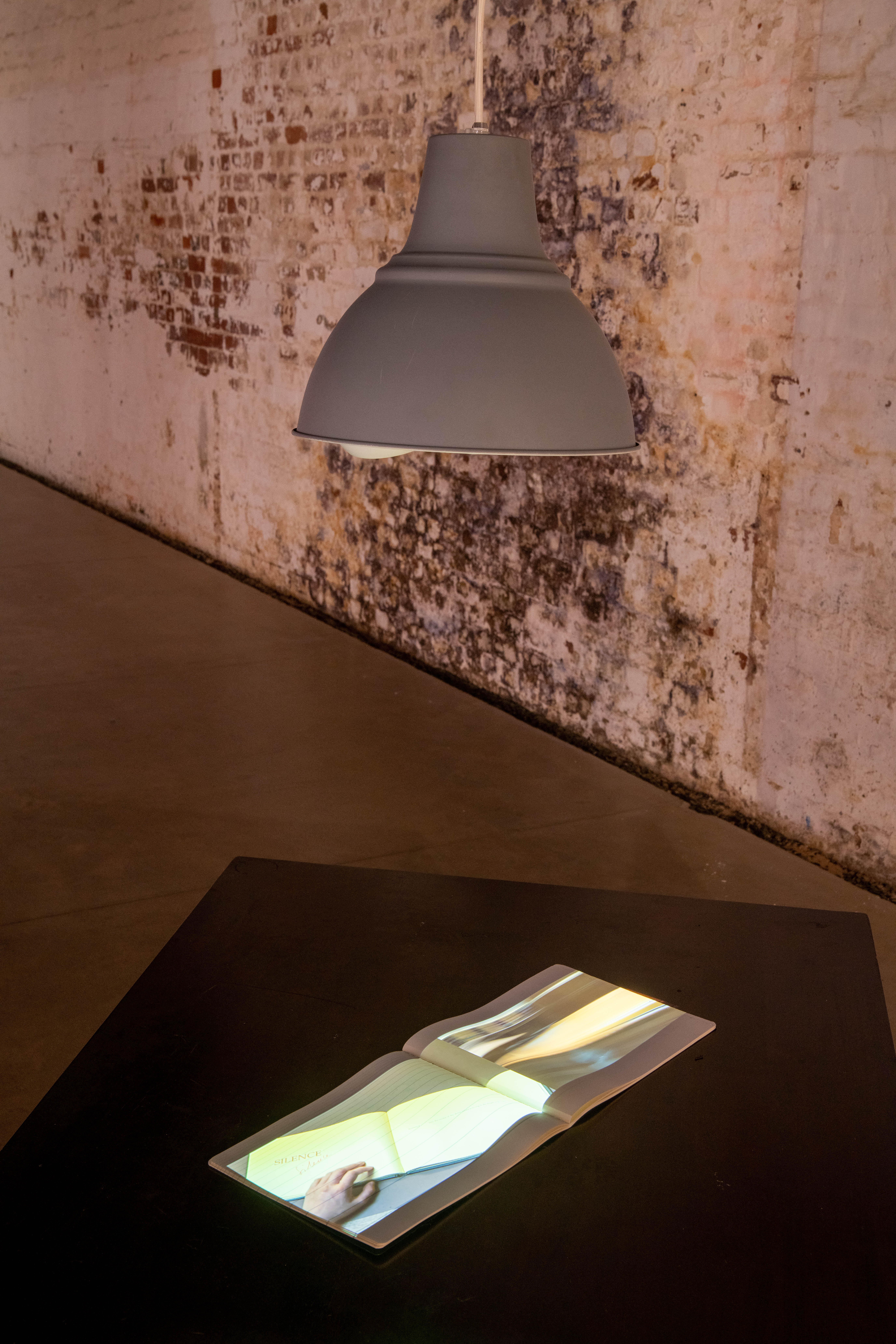 Resonating Silence [two screen projection onto a silkscreen printed book with two channel audio and limited edition vinyl record with silkscreen printed jacket in edition 100 ] was shown as part of TRANSMEDIAL exhibition.