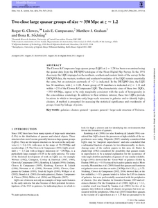 The Clowes & Campusano large quasar group (LQG) at inline image has been re-examined using the quasar data from the DR7QSO catalogue of the Sloan Digital Sky Survey. In the 1991 discovery, the LQG impinged on the northern, southern and eastern limits of the survey. In the DR7QSO data, the western, northern and southern boundaries of the LQG remain essentially the same, but an extension eastwards of ∼2° is indicated. In the DR7QSO data, the LQG has 34 members, with inline image. A new group of 38 members is indicated at inline image and within ∼2bsl000640 of the Clowes & Campusano LQG. The characteristic sizes of these two LQGs, ∼350–400 Mpc, appear to be only marginally consistent with the scale of homogeneity in the concordance cosmology. In addition to their intrinsic interest, these two LQGs provide locations in which to investigate early large-scale structure in galaxies and to identify high-z clusters. A method is presented for assessing the statistical significance and overdensity of groups found by linkage of points.