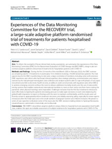 Sandercock, Peter A. G., Darbyshire, Janet, DeMets, David, Fowler, Robert, Lalloo, David G., Munavvar, Mohammed, Staplin, Natalie, Warris, Adilia, Wittes, Janet et al (2022) Experiences of the Data Monitoring Committee for the RECOVERY trial, a large-scale adaptive platform randomised trial of treatments for patients hospitalised with COVID-19. Trials, 23 (1). ISSN 1745-6215