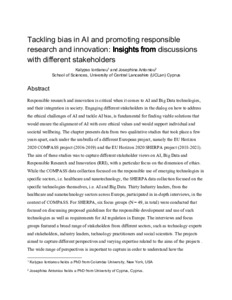 Iordanou, Kalypso orcid iconORCID: 0000-0001-5930-9393 and Antoniou, Josephina orcid iconORCID: 0000-0003-0169-1299 (2022) Tackling Bias in AI and Promoting Responsible Research and Innovation: Insights from Discussions with Different Stakeholders. In: AI and Society. Taylor and Francis, Boca Raton. ISBN 9781003261247