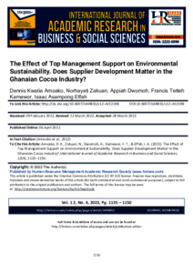 Amoako, Dennis Kwatia, Zakuan, Norhayati, Dwomoh, Appiah, Kamewor, Francis Tetteh and Effah, Isaac Asampong (2022) The Effect of Top Management Support on Environmental Sustainability. Does Supplier Development Matter in the Ghanaian Cocoa Industry? International Journal of Academic Research in Business and Social Sciences, 12 (4). pp. 1135-1150. ISSN 2222-6990