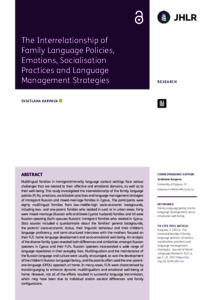 Multilingual families in immigrant/minority language contact settings face various challenges that are related to their affective and emotional domains, as well as to their well-being. This study investigated the interrelationship of the family language policies (FLPs), emotions, socialisation practices and language management strategies of immigrant Russian and mixed-marriage families in Cyprus. The participants were eighty multilingual families from low-middle-high socio-economic backgrounds, including two- and one-parent families who resided in rural or in urban areas. Forty were mixed-marriage (Russian wife and Greek Cypriot husband) families and 40 were Russian-speaking (both spouses Russian) immigrant families who resided in Cyprus. Data sources included a questionnaire about the families’ general backgrounds, the parents’ socio-economic status, their linguistic behaviour and their children’s language proficiency, and semi-structured interviews with the mothers focused on their FLP, home language development and socio-emotional well-being. An analysis of the diverse family types revealed both differences and similarities amongst Russian speakers in Cyprus and their FLPs. Russian speakers incorporated a wide range of language repertoires in their everyday lives. Multilingualism and the maintenance of the Russian language and culture were usually encouraged, as was the development of the children’s Russian-language literacy, and the parents often used the one-parent-one-language (OPOL) approach at home. In many cases, FLPs were characterised by translanguaging to enhance dynamic multilingualism and emotional well-being at home. However, not all of the efforts resulted in successful language transmission, which may have been due to individual and/or societal differences and family configurations.