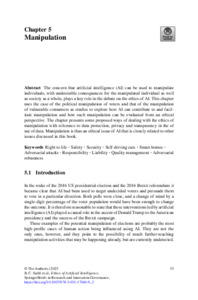 The concern that artificial intelligence (AI) can be used to manipulate individuals, with undesirable consequences for the manipulated individual as well as society as a whole, plays a key role in the debate on the ethics of AI. This chapter uses the case of the political manipulation of voters and that of the manipulation of vulnerable consumers as studies to explore how AI can contribute to and facilitate manipulation and how such manipulation can be evaluated from an ethical perspective. The chapter presents some proposed ways of dealing with the ethics of manipulation with reference to data protection, privacy and transparency in the of use of data. Manipulation is thus an ethical issue of AI that is closely related to other issues discussed in this book.