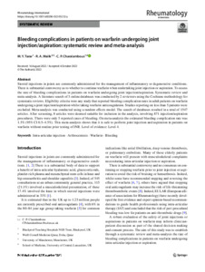 Tarar, M. Y., Malik, R. A. and Charalambous, Charalambos Panayiotou (2022) Bleeding complications in patients on warfarin undergoing joint injection/aspiration: systematic review and meta-analysis. Rheumatology International . ISSN 0172-8172