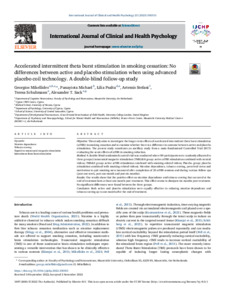 Mikellides, Georgios, Michael, Panayiota, Psalta, Lilia, Stefani, Artemis, Schuhmann, Teresa and Sack, Alexander T. (2023) Accelerated intermittent theta burst stimulation in smoking cessation: No differences between active and placebo stimulation when using advanced placebo coil technology. A double-blind follow-up study. International Journal of Clinical and Health Psychology, 23 (2). p. 100351. ISSN 2174-0852