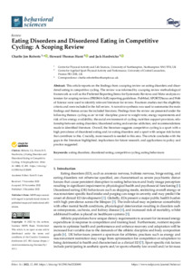 This article reports on the findings from a scoping review on eating disorders and disor- dered eating in competitive cycling. The review was informed by a scoping review methodological framework as well as the Preferred Reporting Items for Systematic Reviews and Meta-analysis ex- tension for scoping reviews (PRISMA-ScR) reporting guidelines. PubMed, SPORTDiscus and Web of Science were used to identify relevant literature for review. Fourteen studies met the eligibility criteria and were included in the full review. A narrative synthesis was used to summarise the main findings and themes across the included literature. Findings from the review are presented under the following themes: cycling as an ‘at-risk’ discipline; power to weight ratio; energy requirements and risk of low energy availability; the social environment of cycling; nutrition support provision; rela- tionship between eating disorders/disordered eating and exercise addiction; and recommendations made in identified literature. Overall, the literature suggests competitive cycling is a sport with a high prevalence of disordered eating and/or eating disorders and a sport with unique risk factors that contribute to this. Crucially, more research is needed in this area. The article concludes with the gaps in the literature highlighted, implications for future research, and applications to policy and practice suggested.